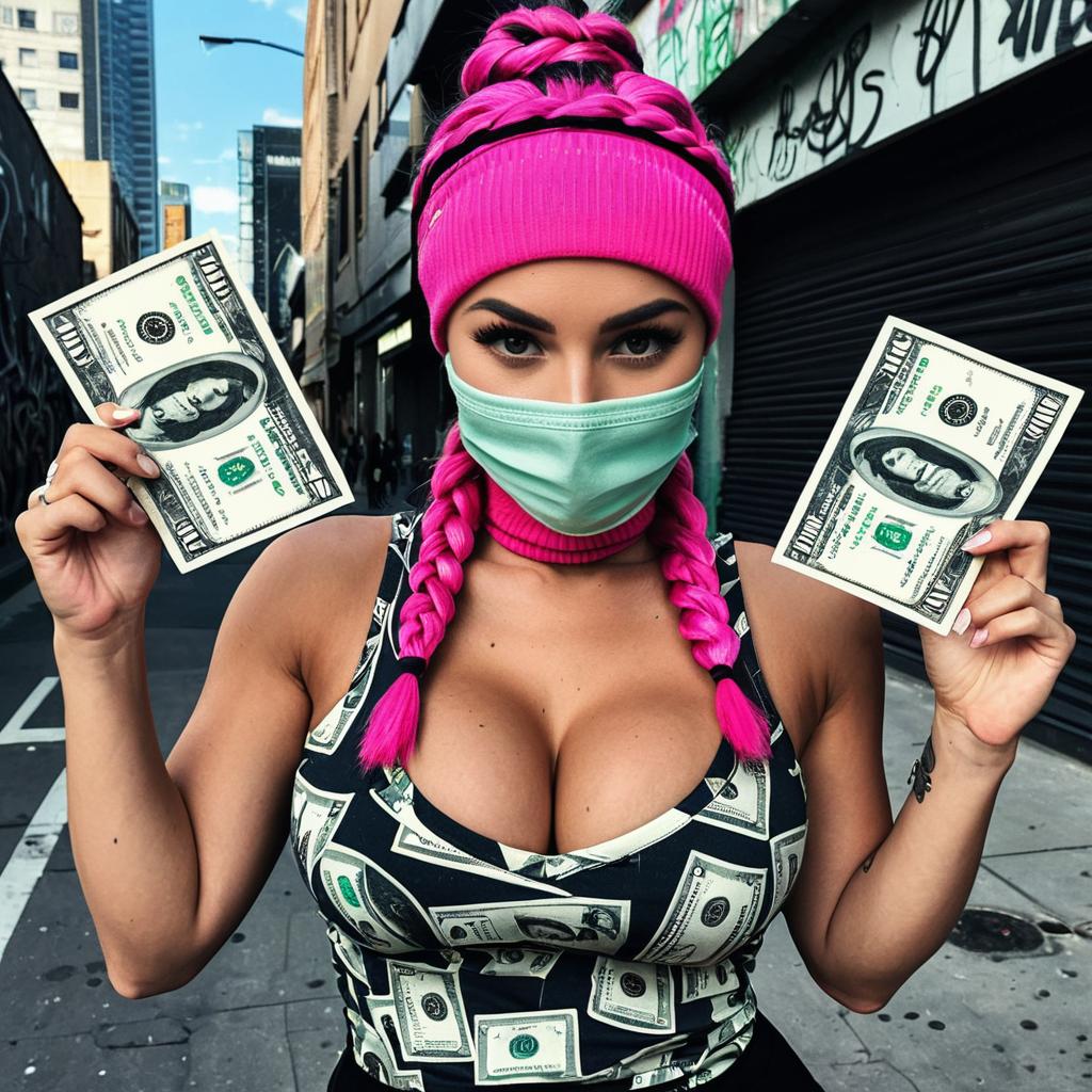 Cartoon characture graffiti art pink braided low bun female with green eyes revealing extra large cleavage money dollar bills and sleek modern avant-garde fashion wear graceful swaying elegant pose original graffiti tech touch the street hustle balaclava friends muscle