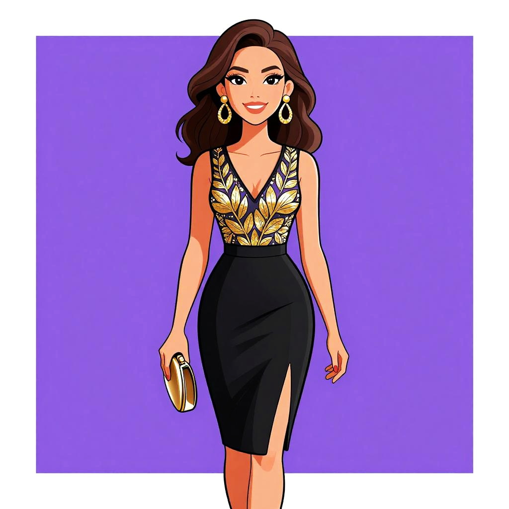 Digital illustration of a stylish woman with long brown hair, wearing a patterned blouse and black high-waisted pants, standing against a purple circle background