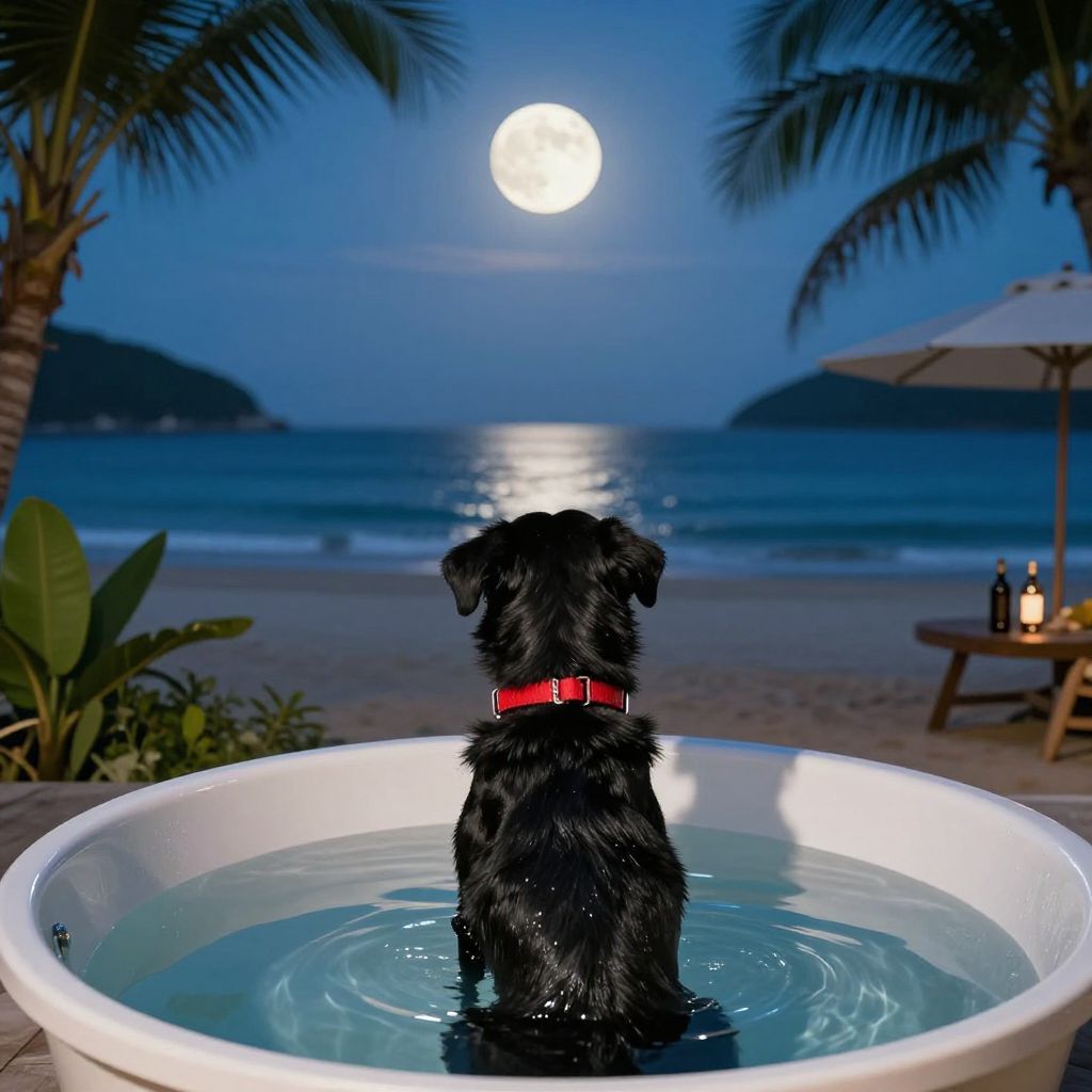 A black dog wearing a red collar sits calmly in a round tub filled with water, facing a serene beach scene illuminated by a bright full moon. Surrounded by lush tropical foliage and distant hills, the scene also features a small wooden table with an umbrella and bottles, reflecting a tranquil nighttime atmosphere.