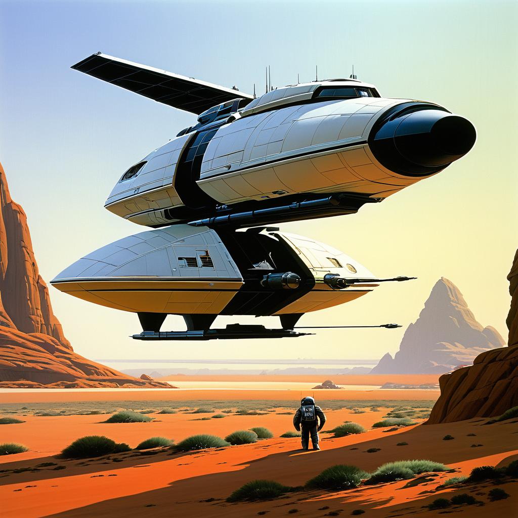 A large futuristic white spaceship hovering above an orange desert with scattered green shrubs and towering rock formations in the background. The scene depicts a solitary astronaut or explorer in a suit walking across the sandy terrain towards the spaceship. The sky is clear and blue, emphasizing the arid and expansive environment.