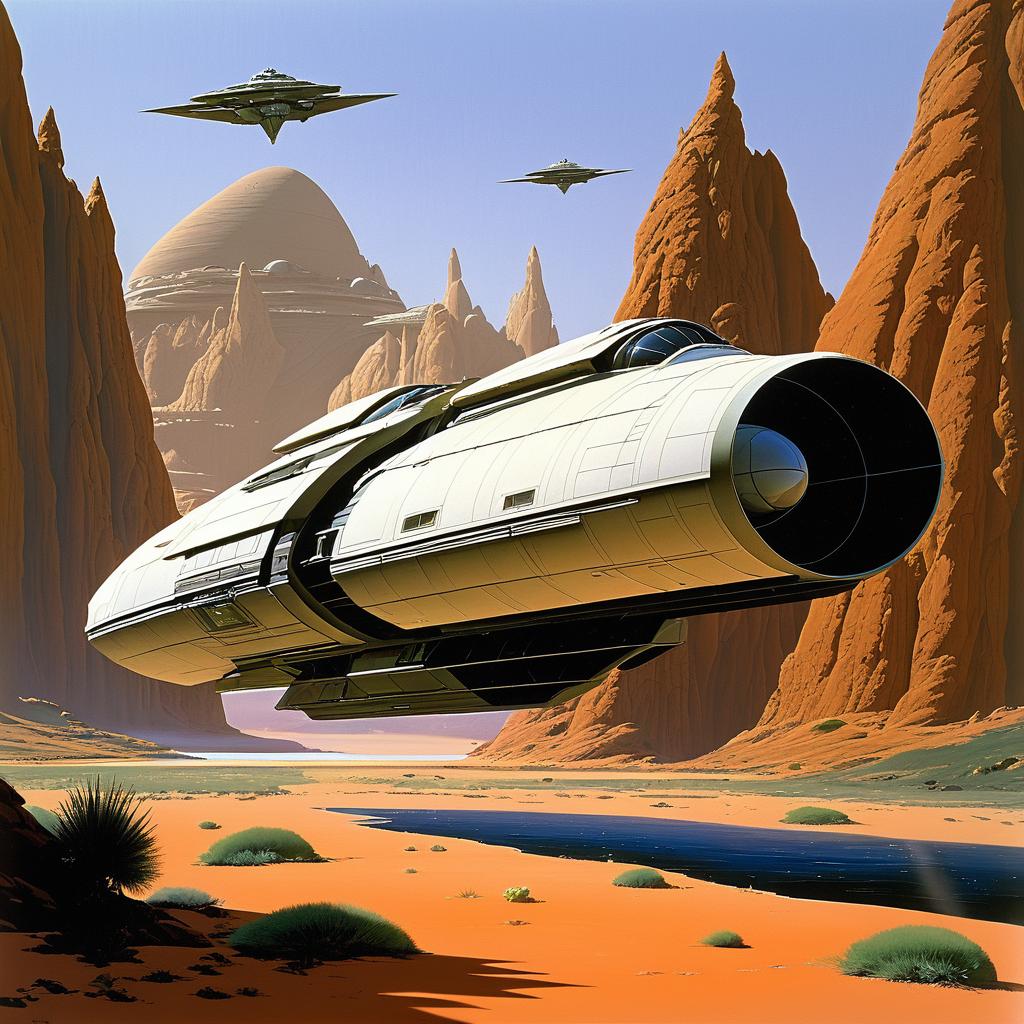 Small organic dropship lander by Ralph McQuarrie, cinematic matte painting style.