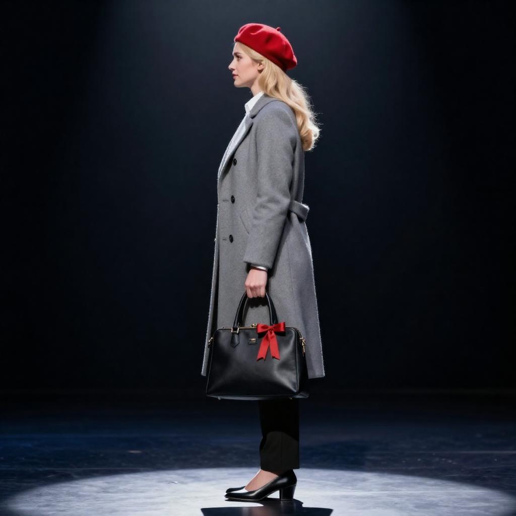 Photograph of a blonde woman in profile, wearing a red beret, gray long coat, white collared shirt, black pants, and black shoes. She holds a black handbag with a red ribbon. Dark background, stage lighting.