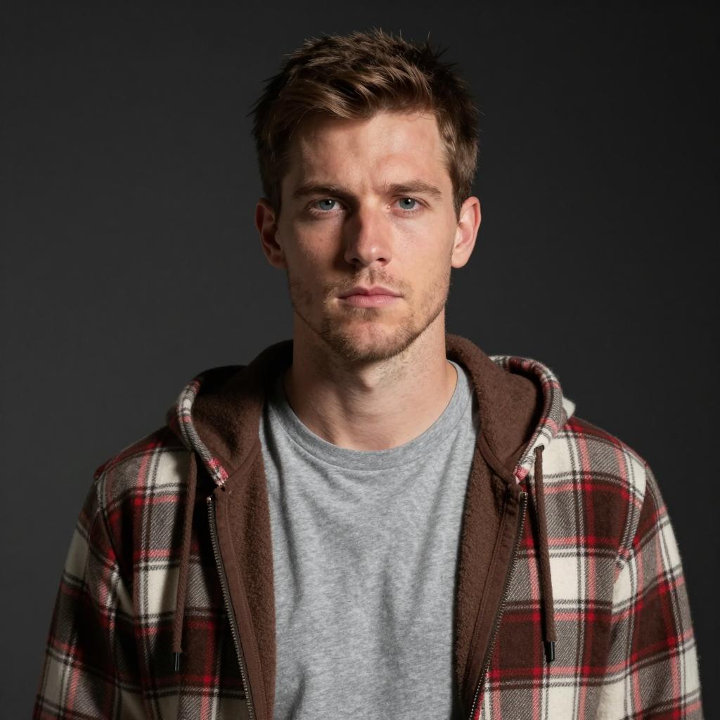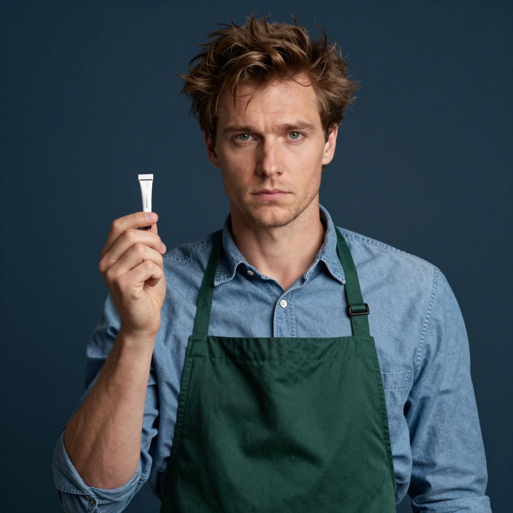 Male with messy brown hair, wearing blue shirt and green apron, holds small object in right hand against dark blue background. Serious expression, upper body centered.