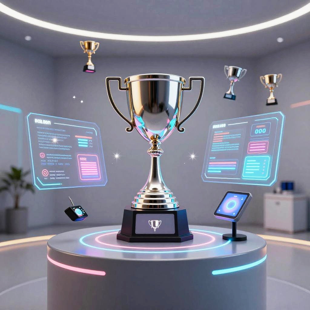 A digital CGI image features a glowing, metallic tag with a large, illuminated number "1" in the center. The tag is suspended in mid-air, surrounded by a bright blue and orange circular light ring. The background is dark with blurred, multicolored line graphs and charts, suggesting a high-tech, data-driven environment. The tag has a small hole at the top for a string. The overall style is futuristic and neon-lit, with a focus on sleek, modern aesthetics and dynamic lighting effects.