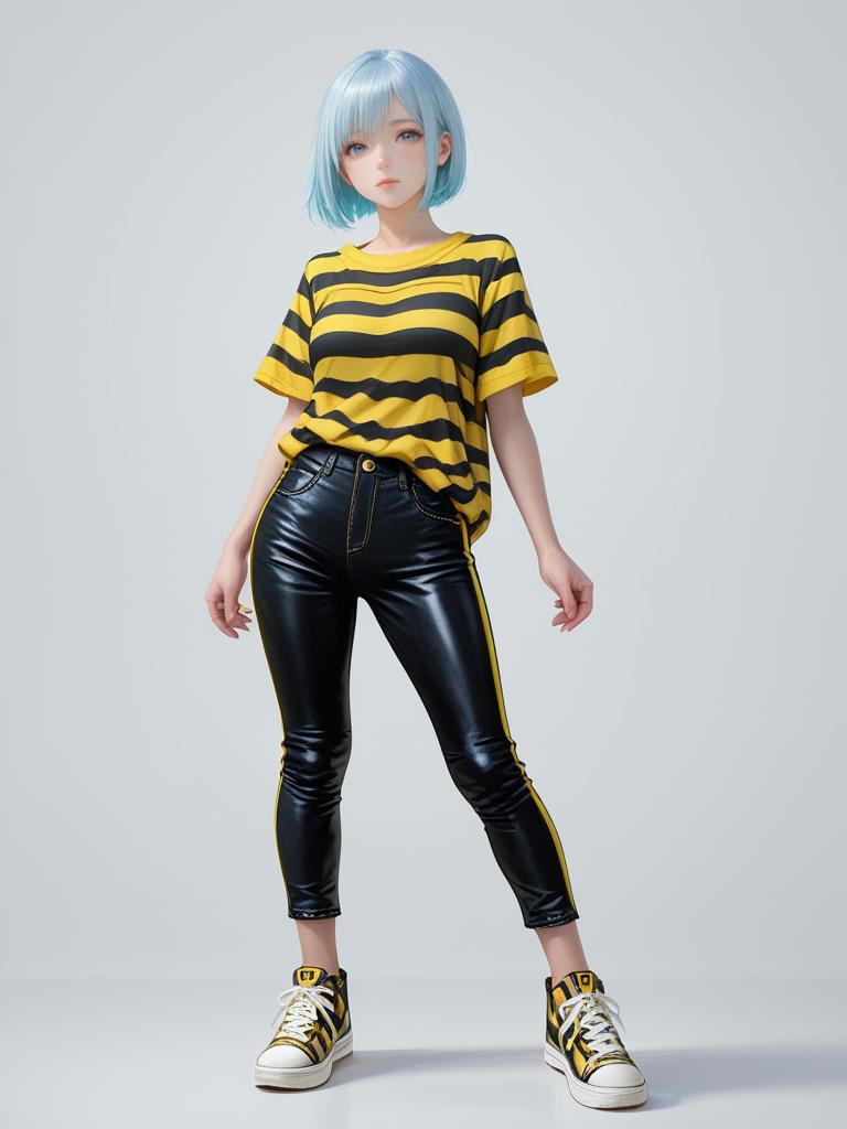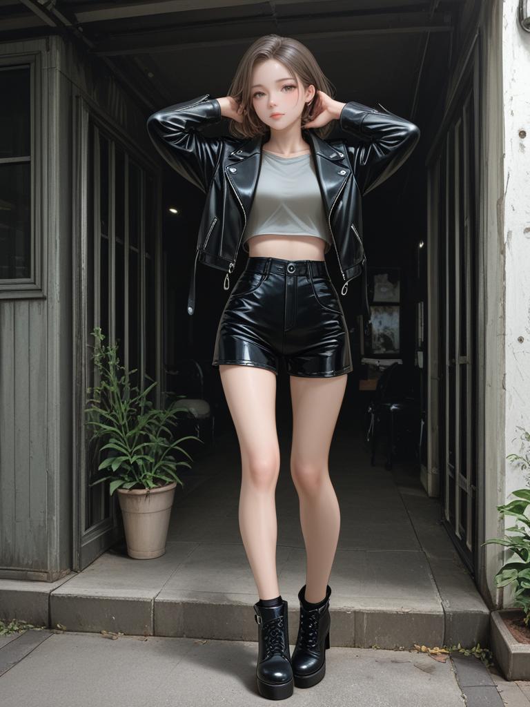 1girl, realistic face, full body shot, Woman, modern chic, cropped pink cardigan with a scalloped lace trim neckline, front tie closure, long fitted sleeves, paired with high-waisted faux leather pants, glossy finish, front seam detail, straight-leg cut, neutral studio background.