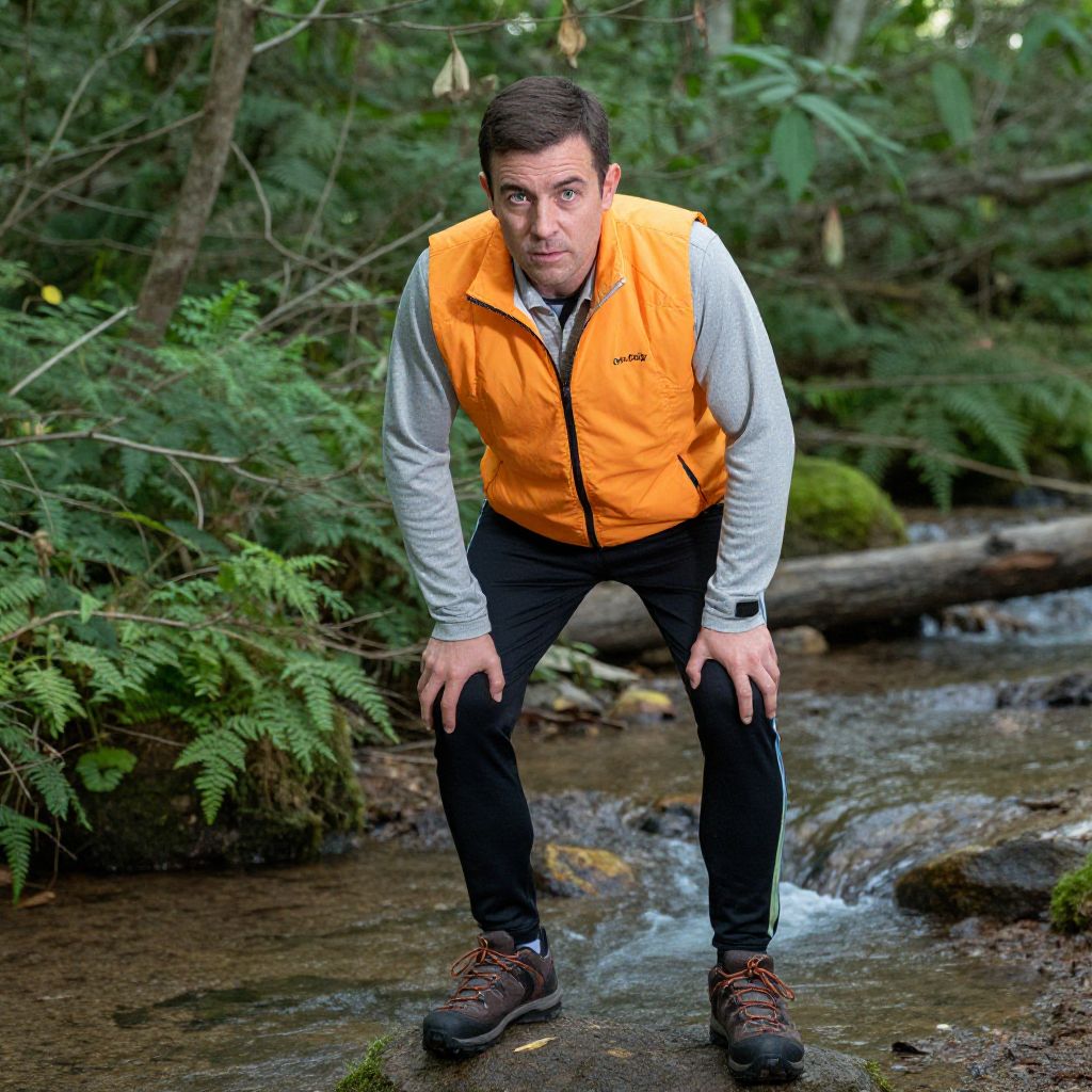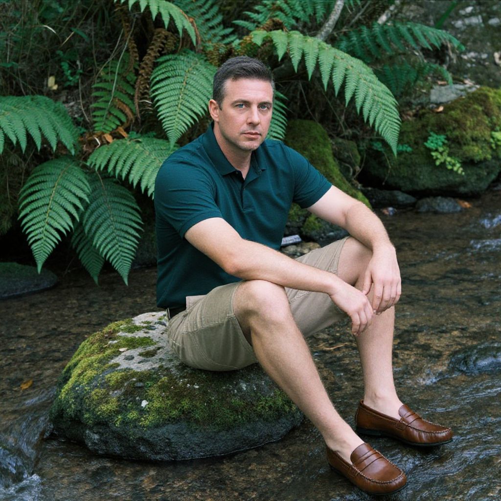 A man, dark green golf polo, khaki denim shorts, brown leather loafers, relaxed and stylish look, serene creek, moss-covered rocks, vibrant ferns, instant film style, contemplative expression. Man has masculine face and piercing eyes