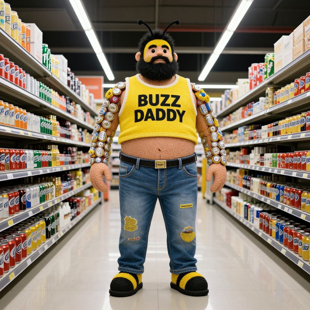 The image is a high-resolution photograph of an elaborate, creative arrangement inside a well-lit supermarket aisle, The centerpiece is a meticulously crafted, life-size model of Full body portrait shot, A giant fat man with a beard who is dressed as a bumble bee, in a crop top tank top, jeans that are skin tight, constructed entirely from cans of soda, along with the word \"BUZZ DADDY\