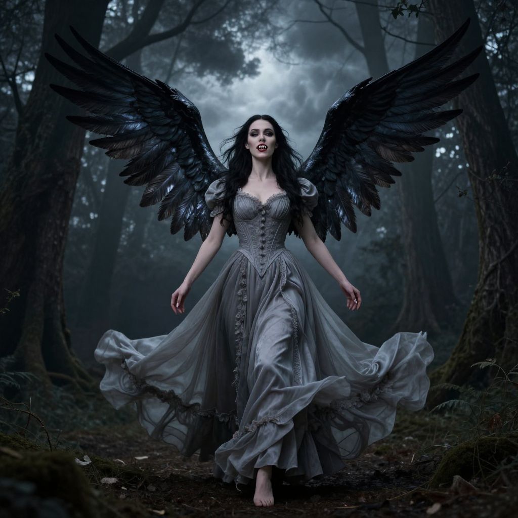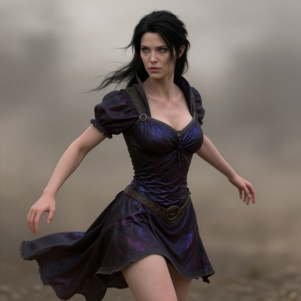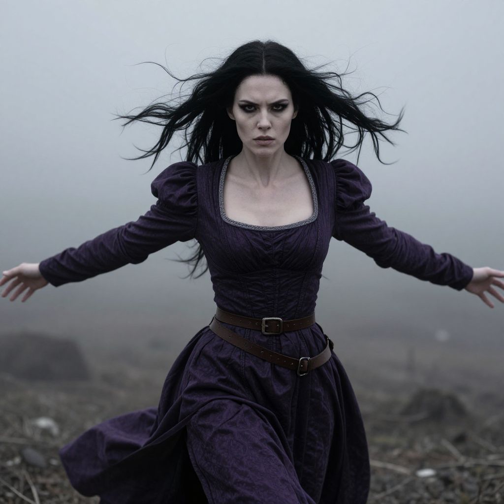 A digital art image of a fierce-looking woman with pale skin and long, black hair blowing in the wind. She's wearing a dark, purple, medieval-style dress with puffed sleeves and a plunging neckline, cinched at the waist with a brown belt. Her arms are outstretched, and she's standing in a foggy, barren landscape. The dress has a slight sheen, and her expression is determined. The background is blurred and gray, emphasizing her sharp focus.