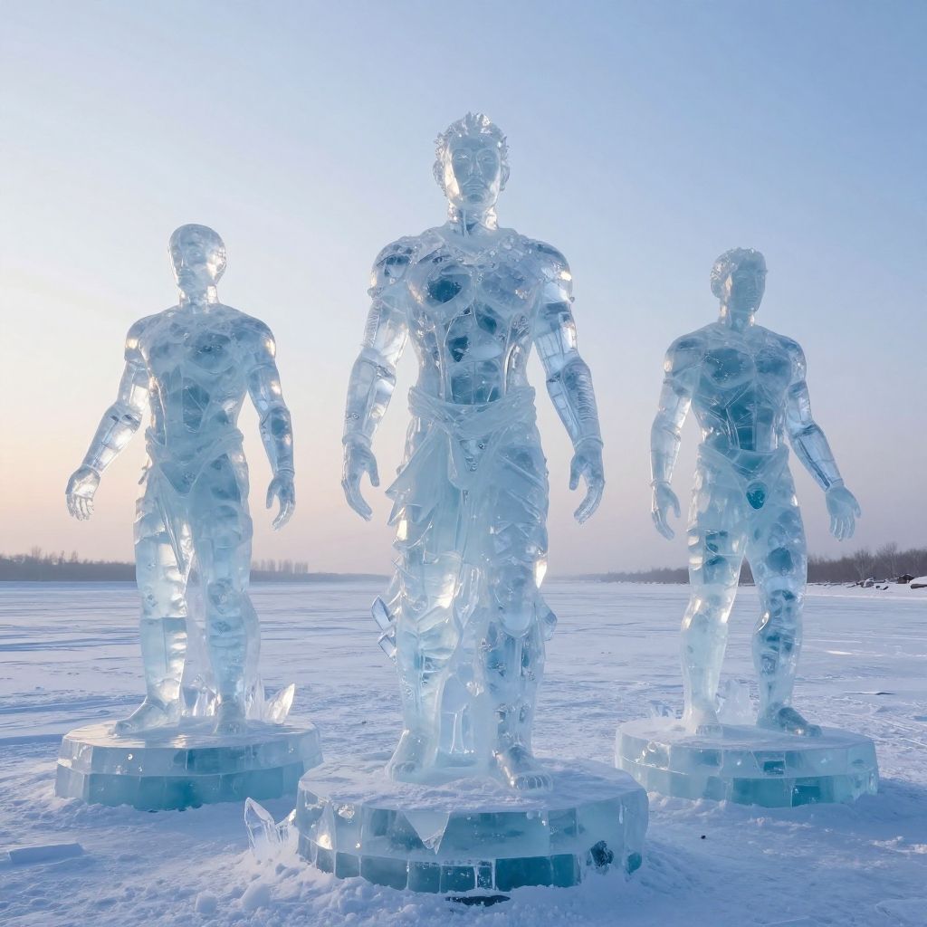 Humanoid figures carved from ice in a frozen landscape, glistening under pale sunlight, intricate crystal details, surreal and ethereal atmosphere, winter fantasy, fine art style
