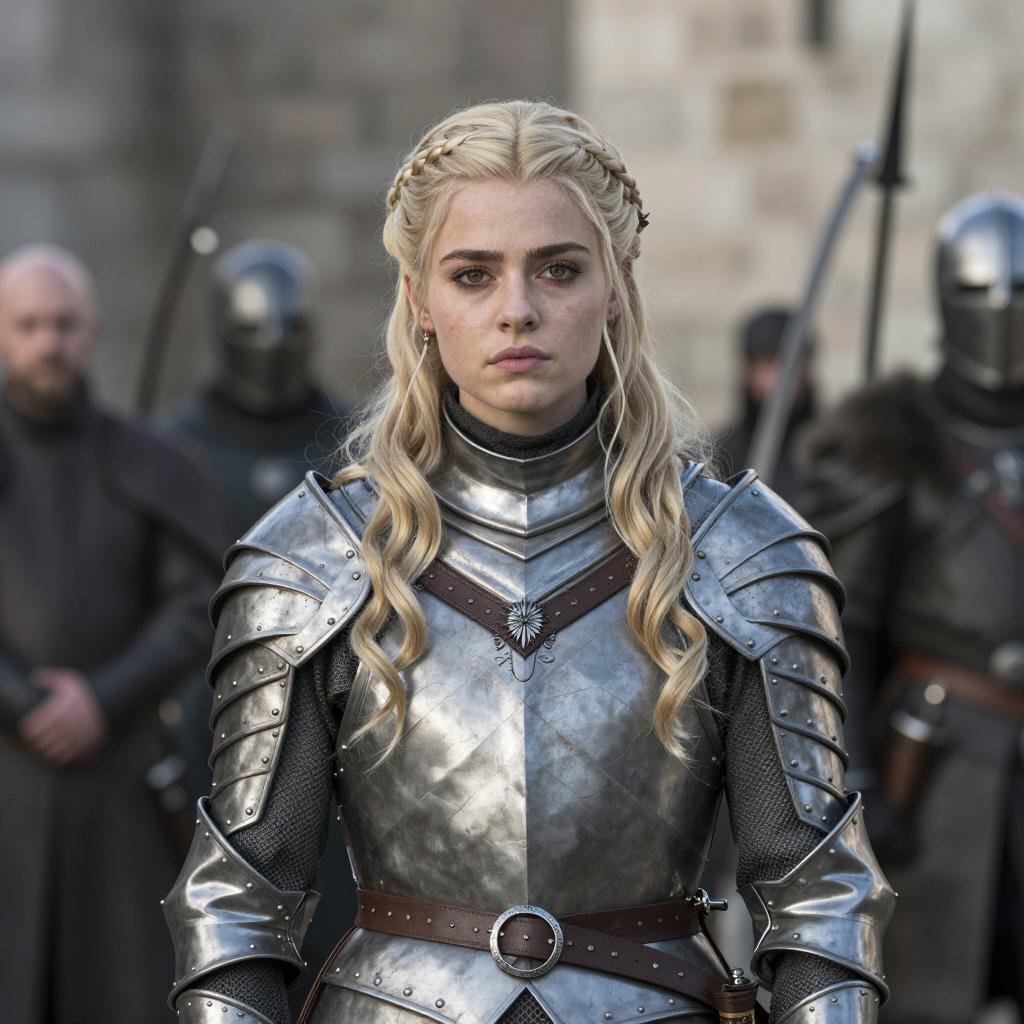 Dany game thrones costume, photo of a young blonde woman with long wavy hair, braided crown, wearing detailed silver medieval armor, standing in front of a stone castle, serious expression, background with blurred medieval figures, sunlight, realistic, high quality, Game of Thrones style, slightly overexposed, strong focus on her face and armor, natural colors