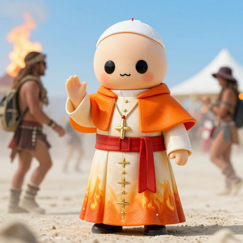 Kawaii Toys photo realistic Catholic Pope Francis greeting people at the Burning Man festival, wearing burning man festival styled pope clothing,