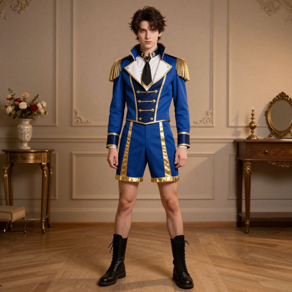 Photograph of a young man standing in an elegant, classical room with ornate beige walls and wooden floors. He has curly dark hair and a serious expression. He wears a royal blue military-style jacket with gold epaulettes, white cuffs, and a black tie, paired with matching blue shorts adorned with gold trim. His legs are bare and he has black, lace-up boots. The background includes a wooden table with a flower vase and a round mirror on the right, and a small chair on the left. The overall style is regal and formal.