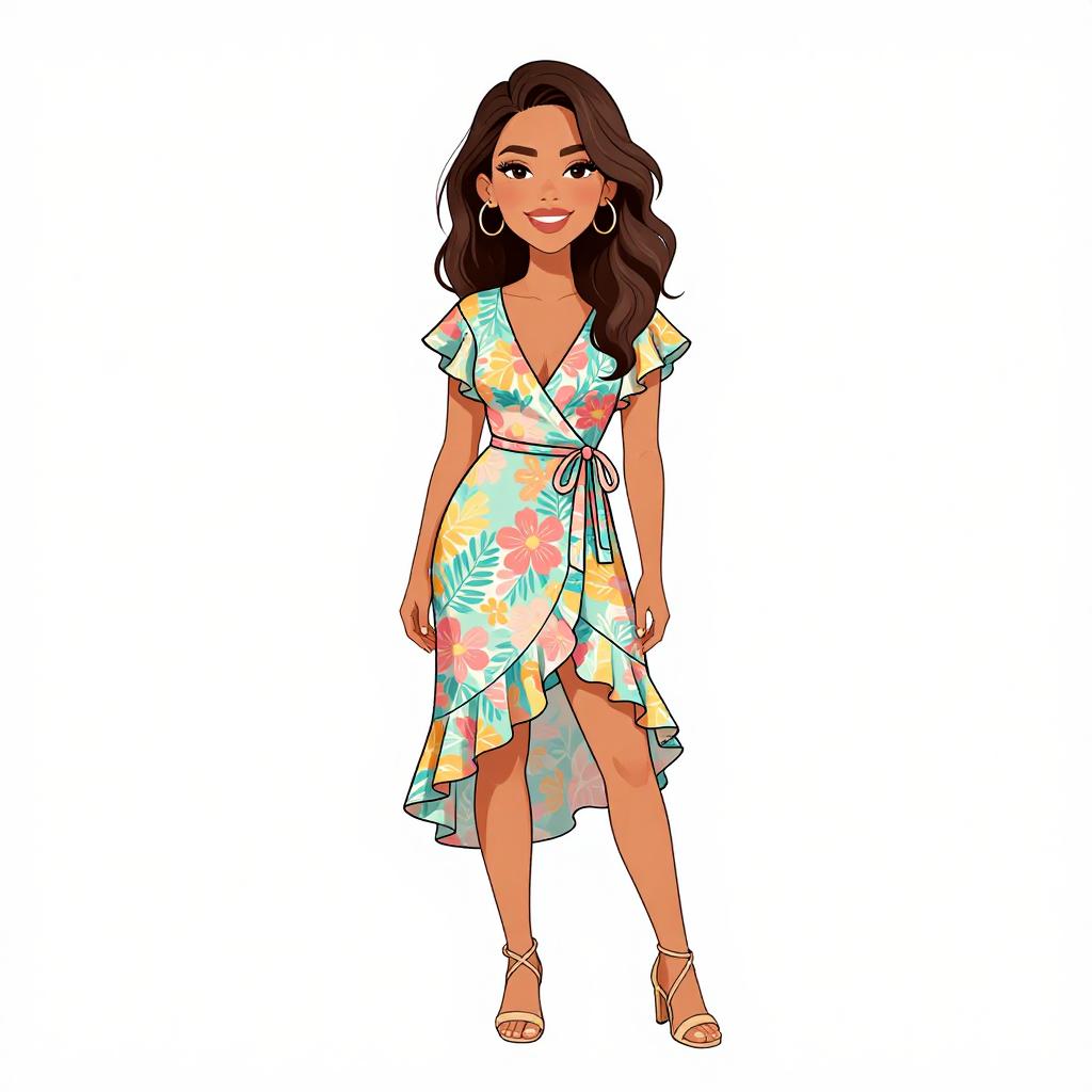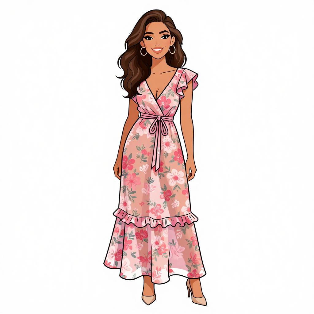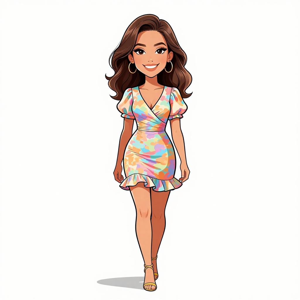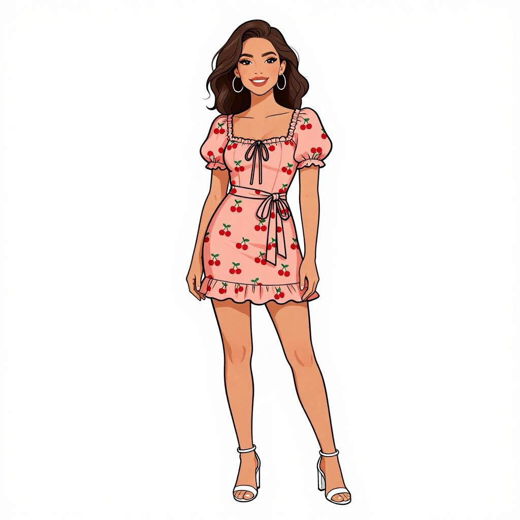 Woman with pretty face and pretty hair. smiling Woman, playful summer style, peach mini dress with red and green cherry print, square neckline, short puff sleeves, front tie detail at bust, fitted waist with belt loops and a matching fabric belt, ruffle hem, paired with white open-toe block heels, plain white background. --sref 1467