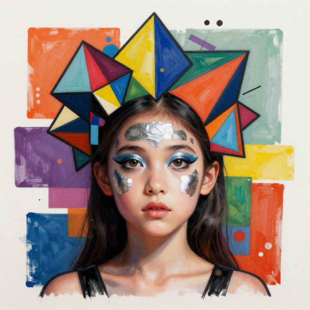 Realistic photo.A vibrant, colorful artwork of a young girl with an elaborate, abstract geometric headpiece and striking metallic makeup. Black inking outlines with vibrant coloring. Inspired by Francis Bacon, layered with decoupage texture, creating a multi-dimensional, expressive effect. realistic photo