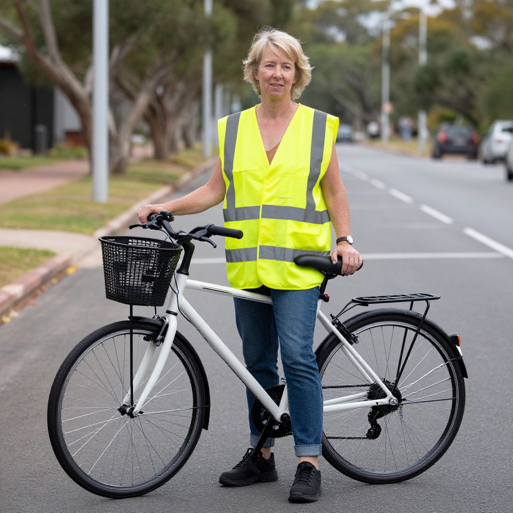 Photograph of a middle-aged, blonde woman standing on a suburban street, holding a white bicycle with a black basket. She wears a bright yellow high-visibility vest over a white shirt, blue jeans, and black shoes. Her short hair is slightly wavy. The background shows a tree-lined road with blurred cars and a sidewalk on the left. The street has white lane markings. The woman is smiling and looking directly at the camera. The image has a clear, colorful, and slightly over-saturated style.