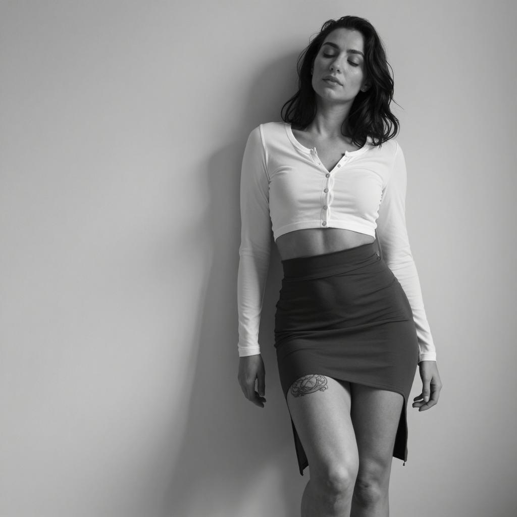Photograph of a woman with long dark hair standing against a gray background. She wears a red double-breasted coat, black fishnet stockings, and black high heels. Her right arm is slightly raised, left arm bent at the elbow. She has a neutral facial expression, looking downward. The coat is open, exposing a dark top underneath. She stands with legs slightly apart.
