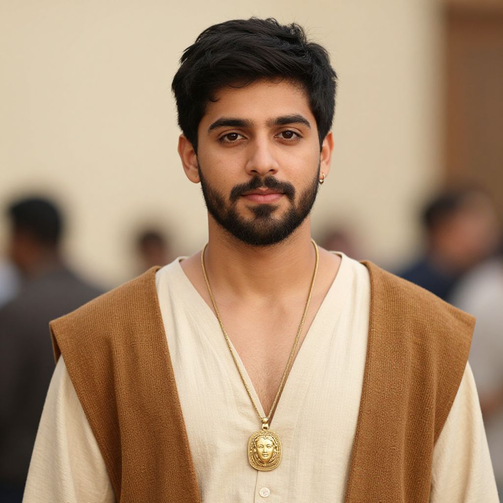 Photograph of a young, shirtless, dark-haired Indian man with a beard, wearing a white toga and gray scarf, standing in a blurred