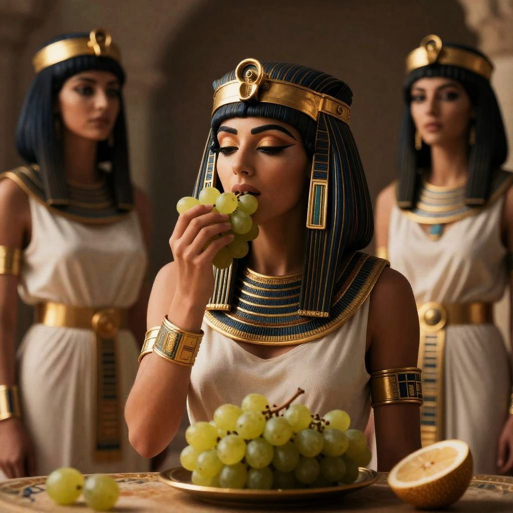 Realistic photo.Cleopatra eating grapes, surrounded by the other ancient queens. The photorealistic rendering uses dramatic lighting and HDR, creating a cinematic and realistic effect. Created with Unreal Engine. realistic photo
