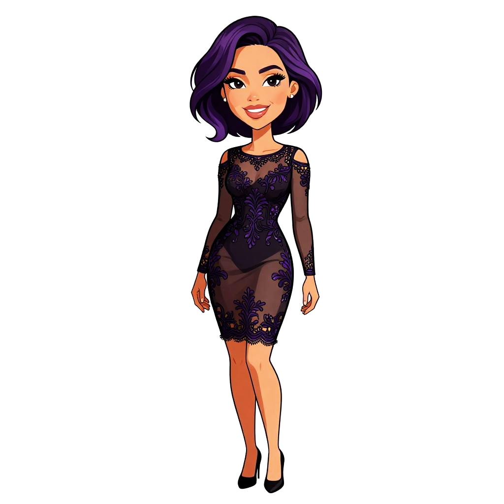 Digital illustration of a smiling, black-haired woman in an off-shoulder, purple, floral-patterned, form-fitting evening gown, standing against