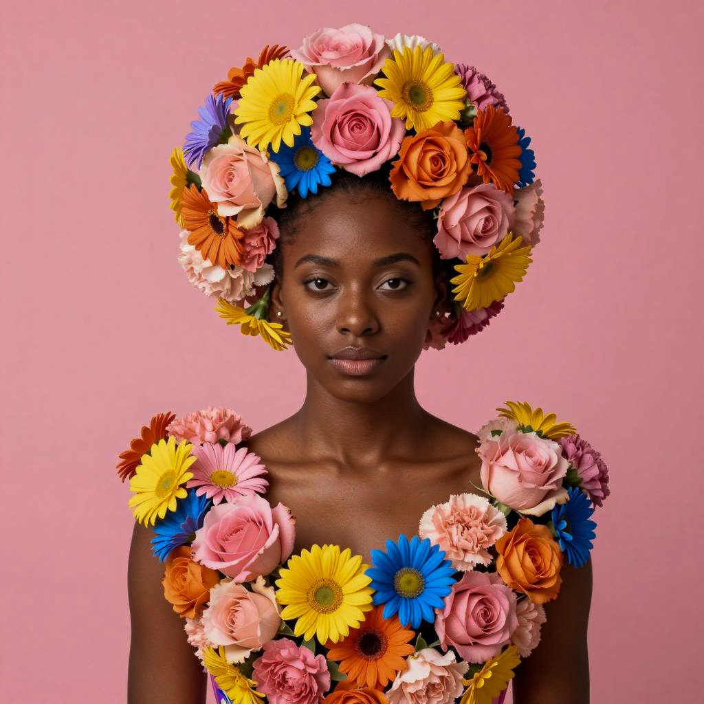 Photograph of a dark-skinned woman with a large, elaborate flower headpiece and matching flower-covered dress. Bright pink background. Vibrant flowers including roses, daisies, carnations in pink, yellow, orange, blue. She has a neutral facial expression. Upper body facing forward. Flowers densely cover her head and dress.