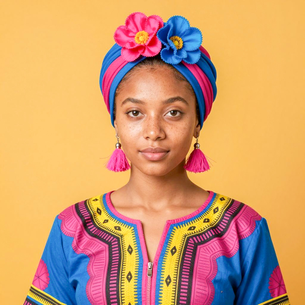 Woman Wearing Vibrant Floral Headpiece and Dress