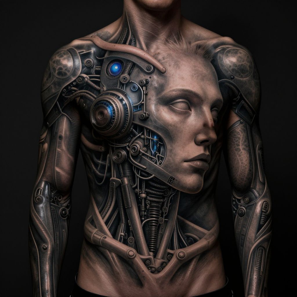 AI art generator for tattoos illustrating surrealist biomechanical tattoos, merging human anatomy with machine parts, highly detailed textures and metallic hues, a dark futuristic vibe with realistic shading and dramatic lighting effects.