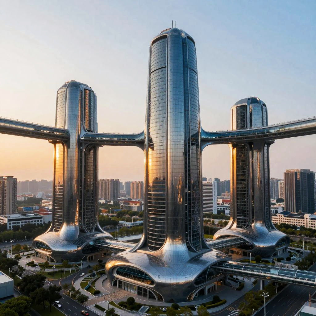 Futuristic city buildings at sunset, gleaming metallic surfaces with intricate patterns, transparent walkways bridging skyscrapers, advanced technology seamlessly integrated with nature and greenery.