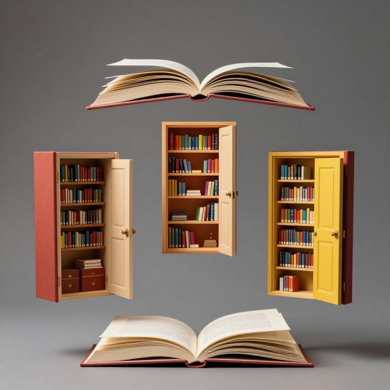A digital illustration depicts three open wooden bookshelves floating in mid-air against a gray background. Each shelf is filled with colorful books and has a door that is open, revealing the interior. Above and below the shelves, two large open books with white pages and dark red covers hover, creating a sense of floating. The bookshelves are evenly spaced in a triangular formation, with the bottom book larger than the top one. The image uses a realistic style with sharp lines and vibrant colors, emphasizing a magical or fantastical theme.