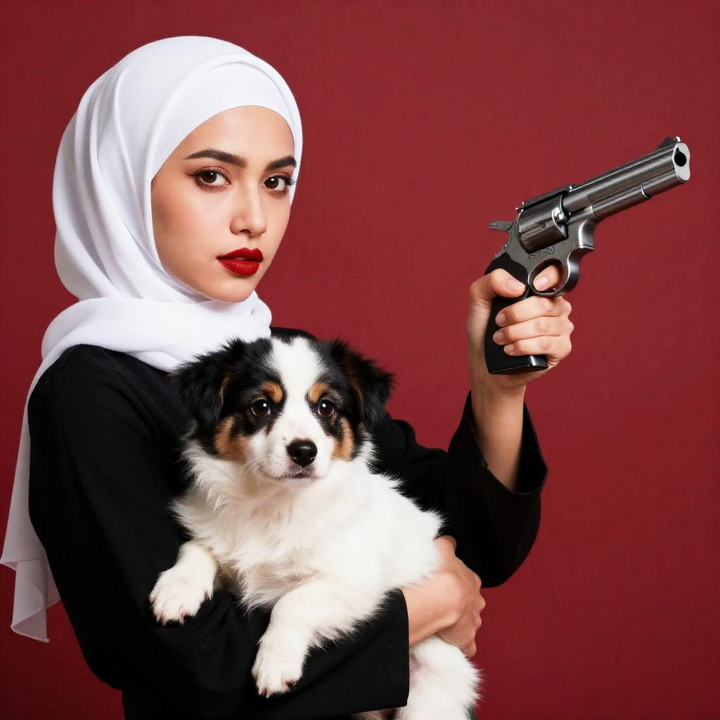 Photograph of a woman in a white hijab and black dress holding a white and black dog in her left arm, pointing a revolver with her right hand. Bright red background. Woman has intense gaze, red lipstick. Dog has curious expression.