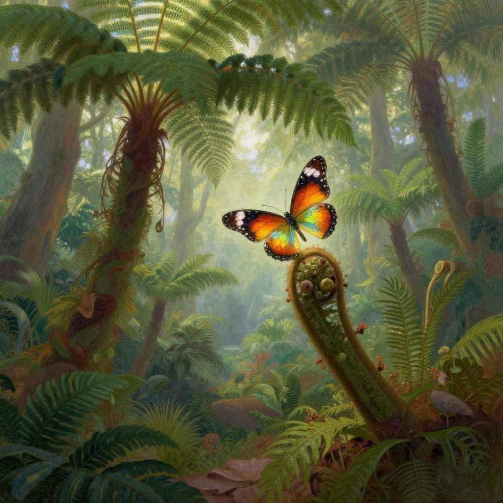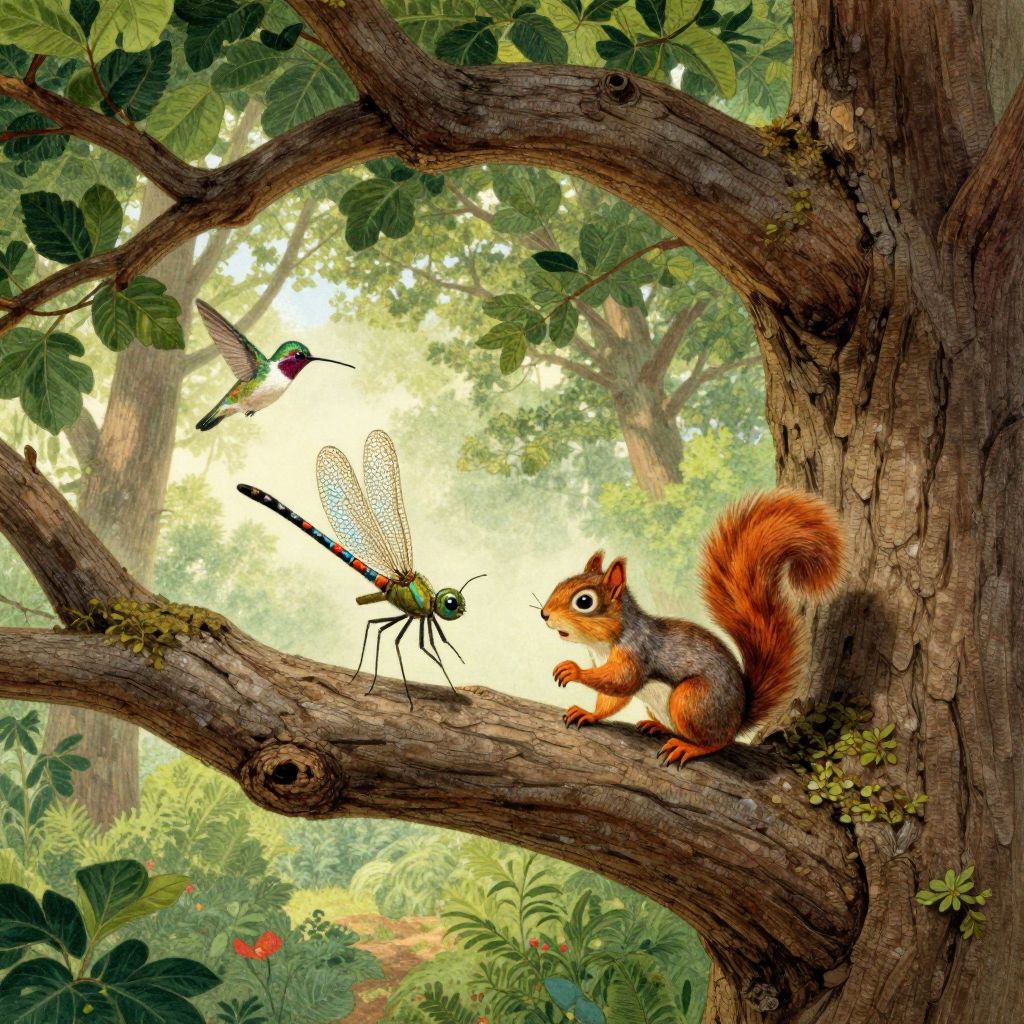 Craft an image reminiscent of a vintage children's book illustration, portraying a charming scene where a delicate dragonfly with shimmering wings engages in a playful exchange with a cunning squirrel resting on the twisted branch of an ancient oak tree. Capture this captivating moment from an unexpected angle, as if seen through the perspective of a hummingbird gliding overhead, unveiling the intricate tapestry of the verdant forest below and evoking a sense of enchantment and curiosity within the viewer.