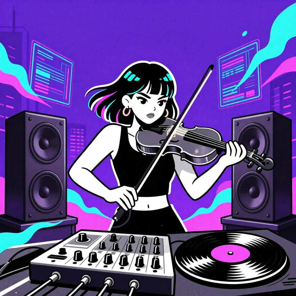 A bold, high-contrast graphic digital illustration of a energetic female electronic violinist with neon hair and LED bow, hands working a sleek mixer and vinyl, flanked by two towering speakers in a sleek urban rooftop illuminated by holographic signs. Background awash in electric purple with bright cyan and neon pink waves, radiating lively, energetic vibes. Thick black-and-white outlines, crisp edges, duotone shading, subtle paper grain, punchy saturation, dynamic composition, motion lines, bassy atmosphere.
