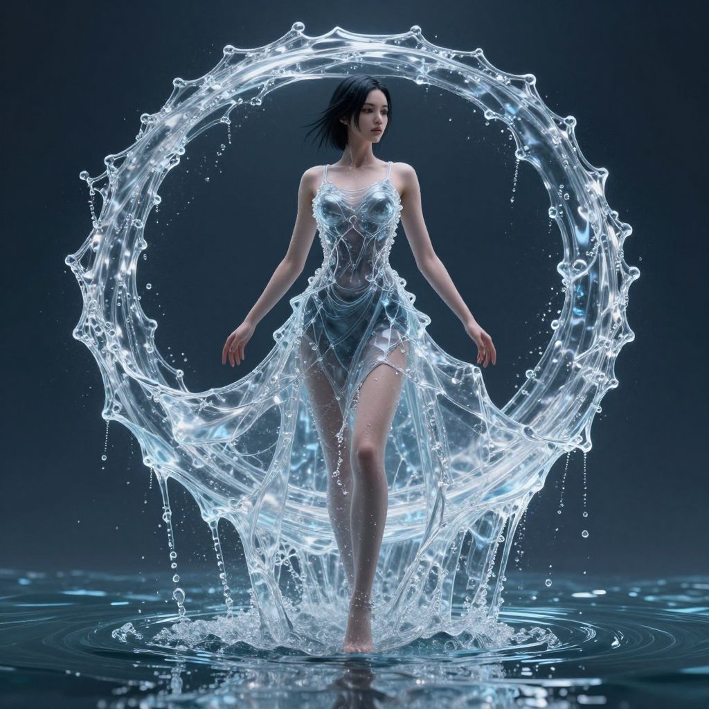 Cyberpunk A woman wearing a dress made of water, the dress drops down in a circular way and merges into the water, detailed, fantasy, high resolution, photorrealistic,