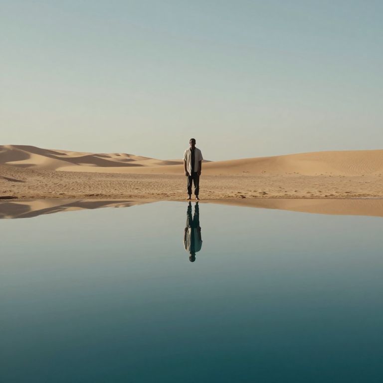 Photograph of a lone man standing on a reflective desert oasis, with golden sand dunes and clear blue sky in the background. His reflection mirrors perfectly