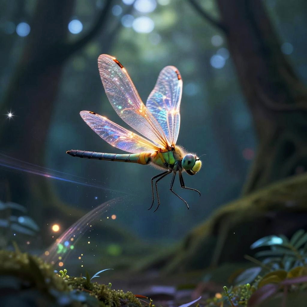 Photograph of a tranquil forest stream at dawn. Two delicate dragonflies with transparent wings hover above the reflective water, mirrored below. The background features tall, dark trees and a misty, purple-tinged sky with the sun peeking through. Moss-covered rocks and sparse vegetation line the stream's banks. The scene is ethereal, with the soft light creating a magical atmosphere. The dragonflies' intricate wings contrast with the smooth, reflective water and the textured, mossy rocks. The overall color palette includes deep blues, purples, and greens, enhancing the mystical feel.