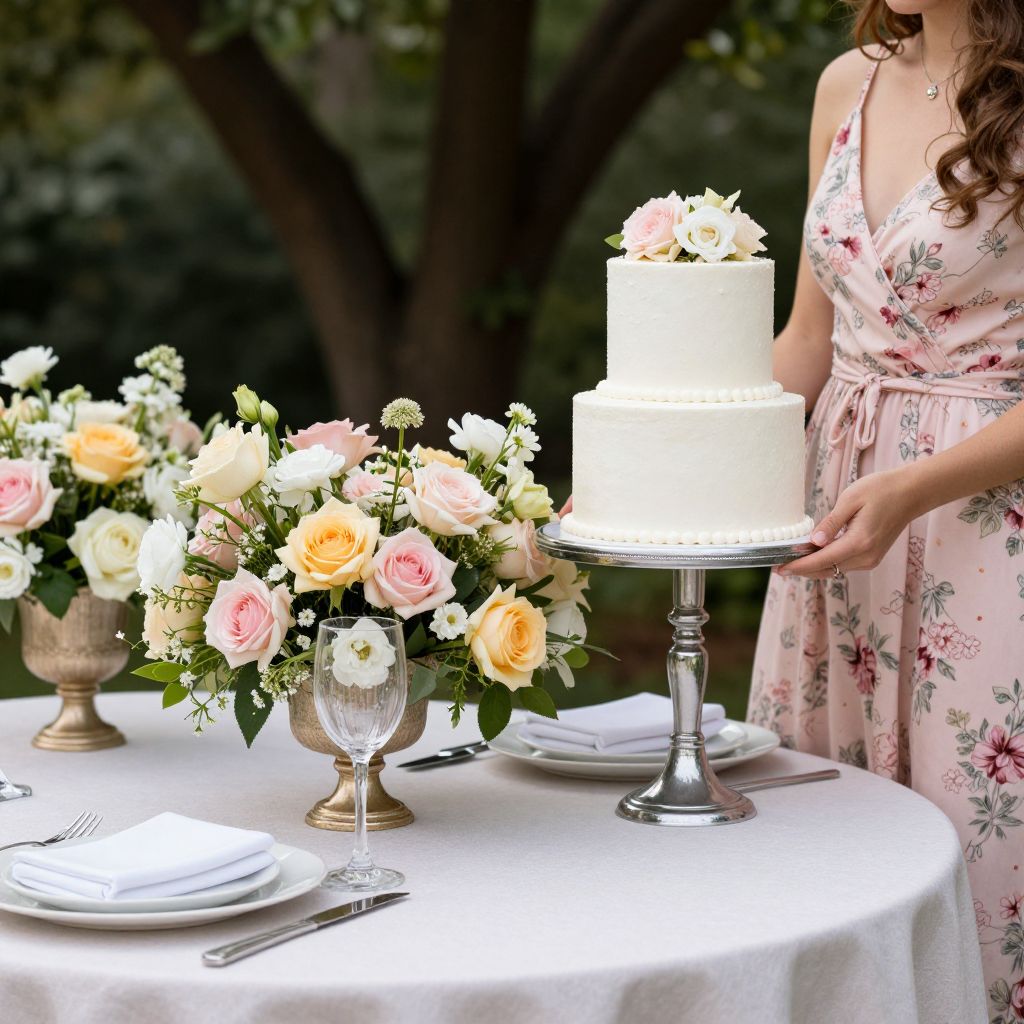 Photograph of a woman with curly brown hair in a pink floral dress, standing beside a three-tiered white wedding cake on a glass pedestal, outdoors. She is placing the cake on a round white-clothed table. The table features elegant glassware, white plates with folded napkins, and a centerpiece of pink, white, and yellow roses in a brass vase. The background shows lush green foliage and a wooden fence. The scene is well-lit with natural sunlight, highlighting the delicate textures and colors.