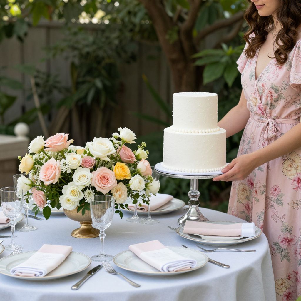 Elegant secret garden bridal shower setup featuring a floral centerpiece of pink, white, and yellow roses on a pastel table setting, complemented by a delicate three-tiered white frosted cake held gently by a woman in a pink floral dress.