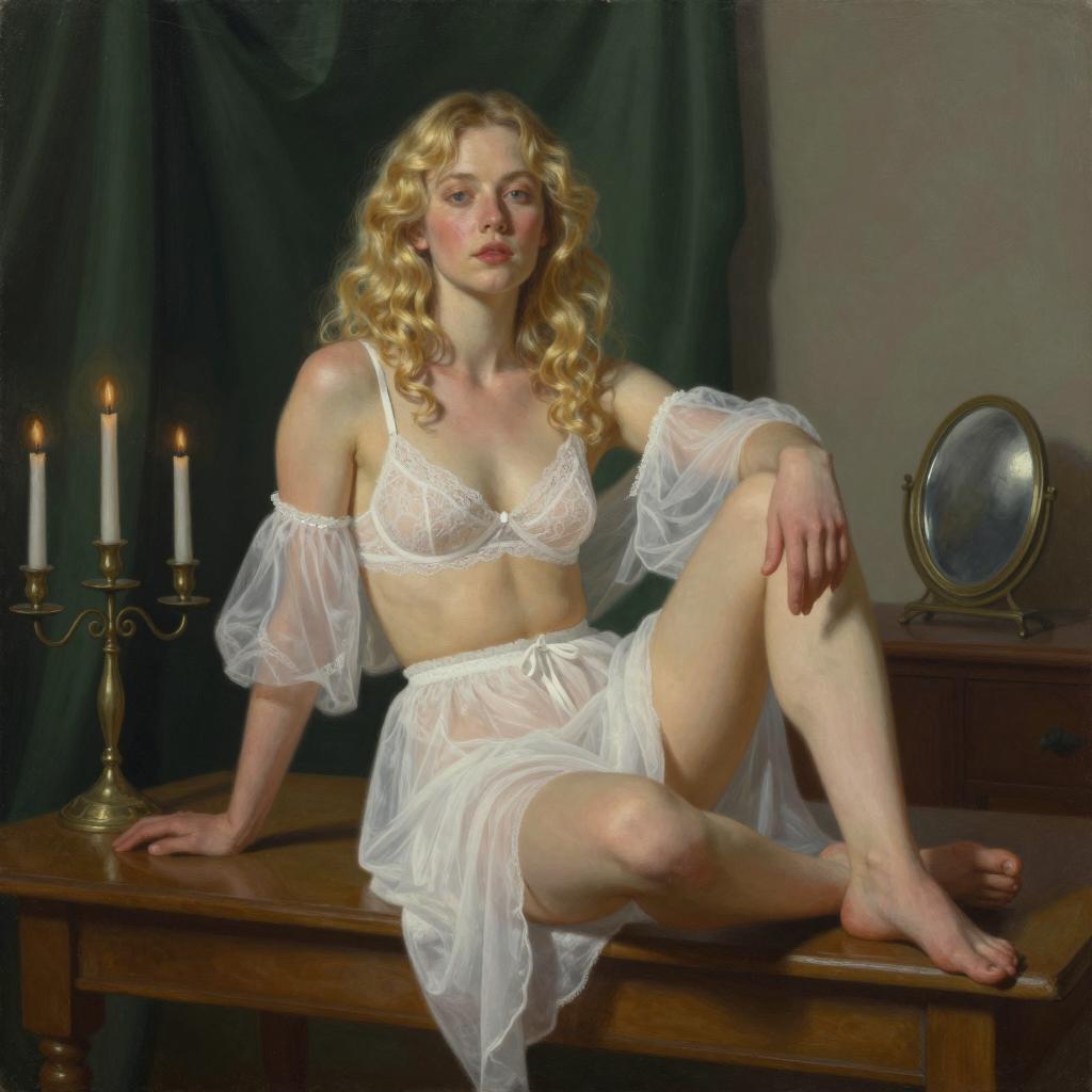Oil painting of a woman and a man. Woman with light skin, brown wavy hair, black and white clothing, looking up at man. Man with light skin, short dark hair, white shirt, leaning forward. Blurred dark figure in background. Woman's expression: hopeful. Man's expression: neutral. Woman's neck slightly tilted upward. Loose, impressionistic brushstrokes. Woman on left, man on right. Two people.