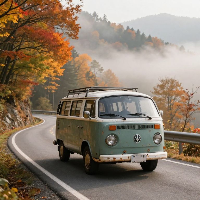 Kombi van driving through a scenic mountain road in autumn, colorful foliage on the trees, misty morning light casting soft shadows, vintage style with detailed textures of rusty metal and worn paint, evoking a sense of adventure and freedom.