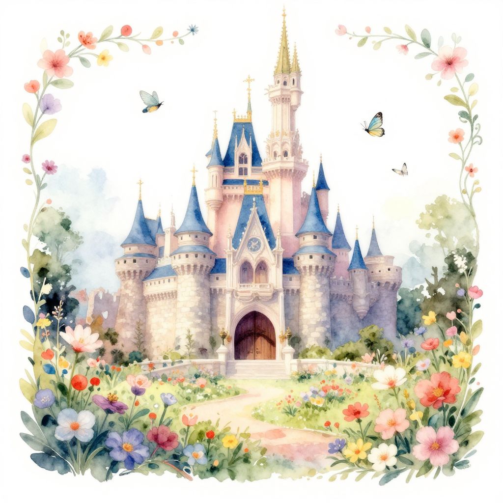 Watercolor painting of a mystical fantasy castle surrounded by lush trees and blooming flowers. The castle features tall spires and turrets with a soft pastel palette dominated by pinks, greens, and blues, creating an enchanting fairy tale atmosphere. The winding path leads to the main entrance, framed by vibrant pink flowering trees and detailed greenery in a fantasy art style inspired by John Howe.