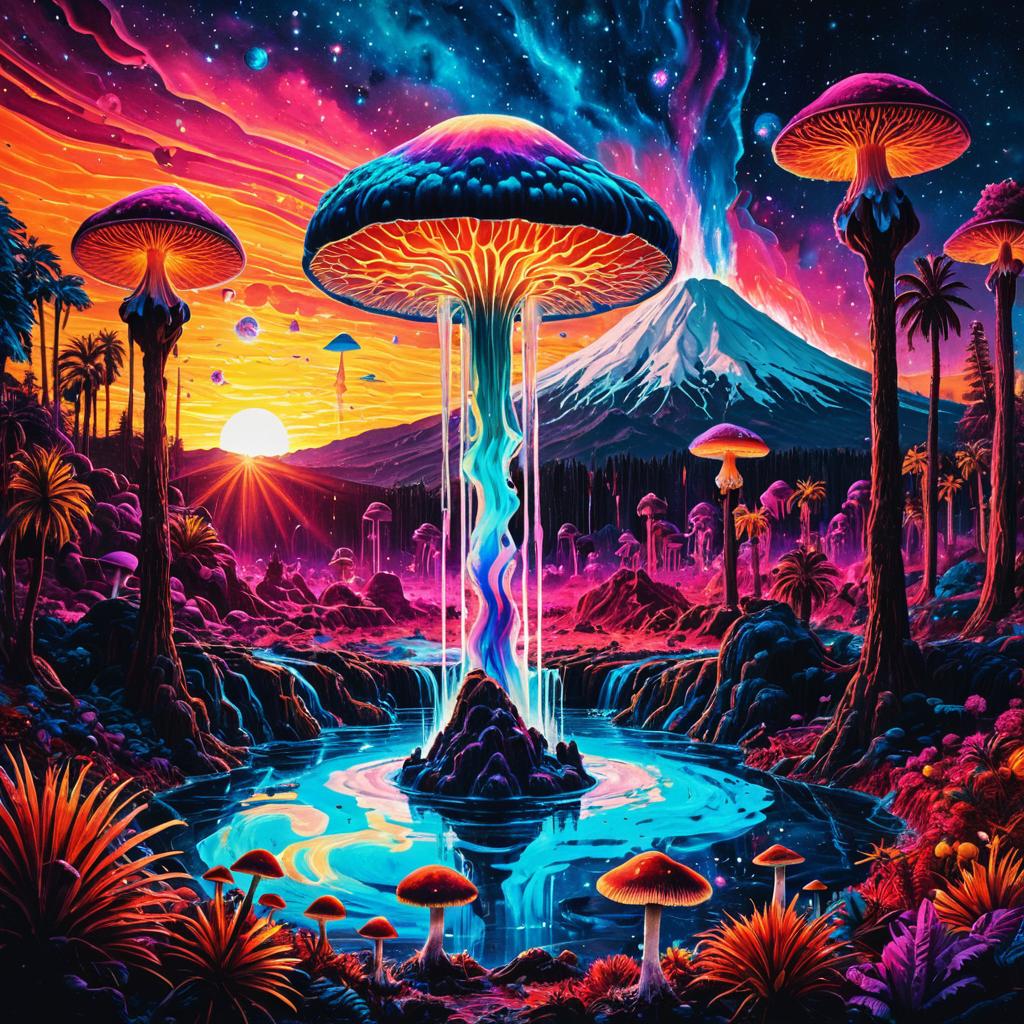 Psychedelic melting mushroom forest on a colorful glowing bismuth planet with liquid nebulas, palm trees, erupting volcanoes with sunset colors, waterfalls, melting landscape, fluid marble waves, prismatic glow
