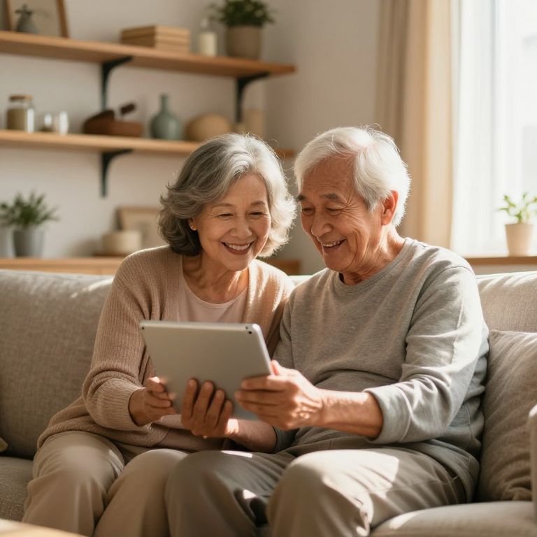 Senior couple sitting together on a cozy couch, sharing a moment of joy as they hold and interact with a tablet, surrounded by warm, inviting decor including wooden shelves filled with various items and soft natural light streaming through curtains.