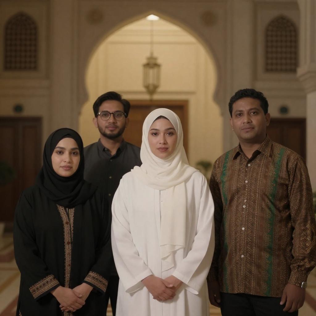 Three young women smiling happily outdoors in a lush green park with city buildings blurred in the background, one woman wearing a beige hijab and maroon top, the second woman with short black hair, large black glasses, and a pink blazer, the third woman with brown hair tied with a white patterned scarf and navy blue top, all posing closely together with bright daylight illuminating their joyful expressions and vibrant colors surrounding them
