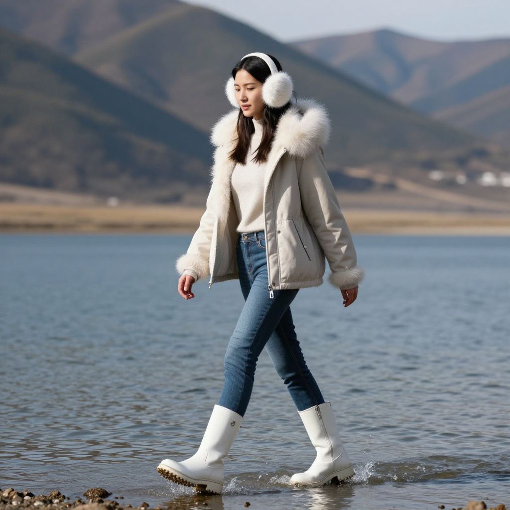 Photograph of an Asian woman walking along a shore with a lake in the background, surrounded by mountains. She has long black hair, wearing a white fur-trimmed winter jacket, blue jeans, and white snow boots. She also has white earmuffs on her head. The water around her feet is shallow, and she is stepping on small rocks. The sky is clear, and the mountains are brown and green, indicating a late autumn or early winter setting. The woman's expression is neutral, and she is looking slightly downwards.