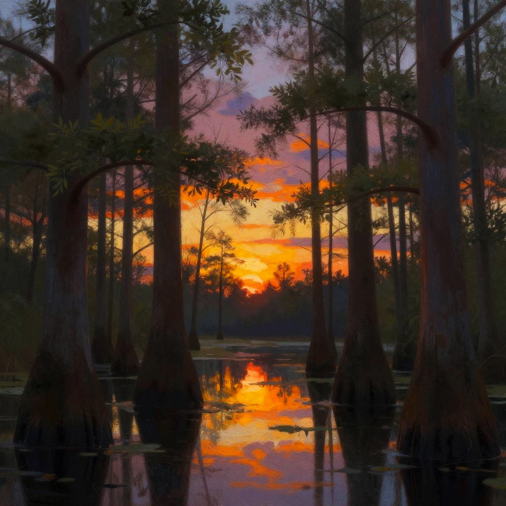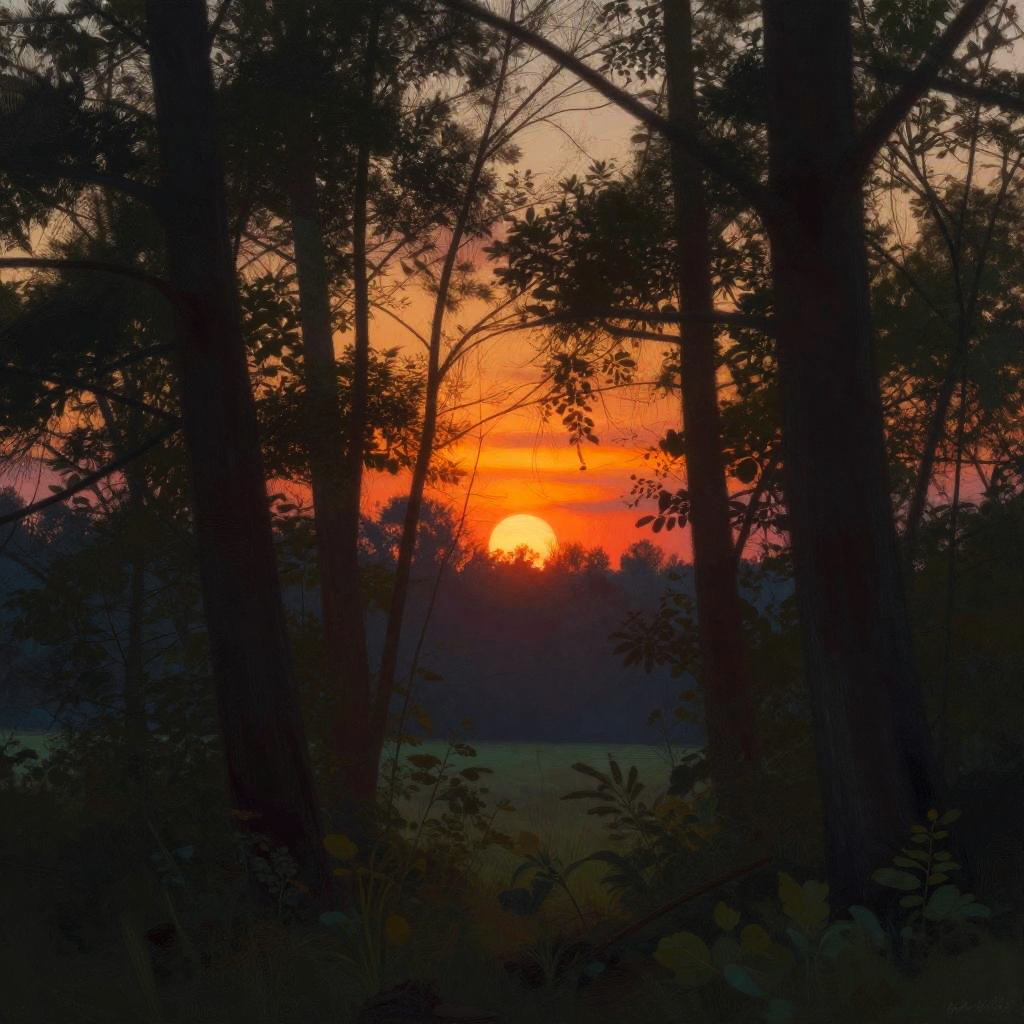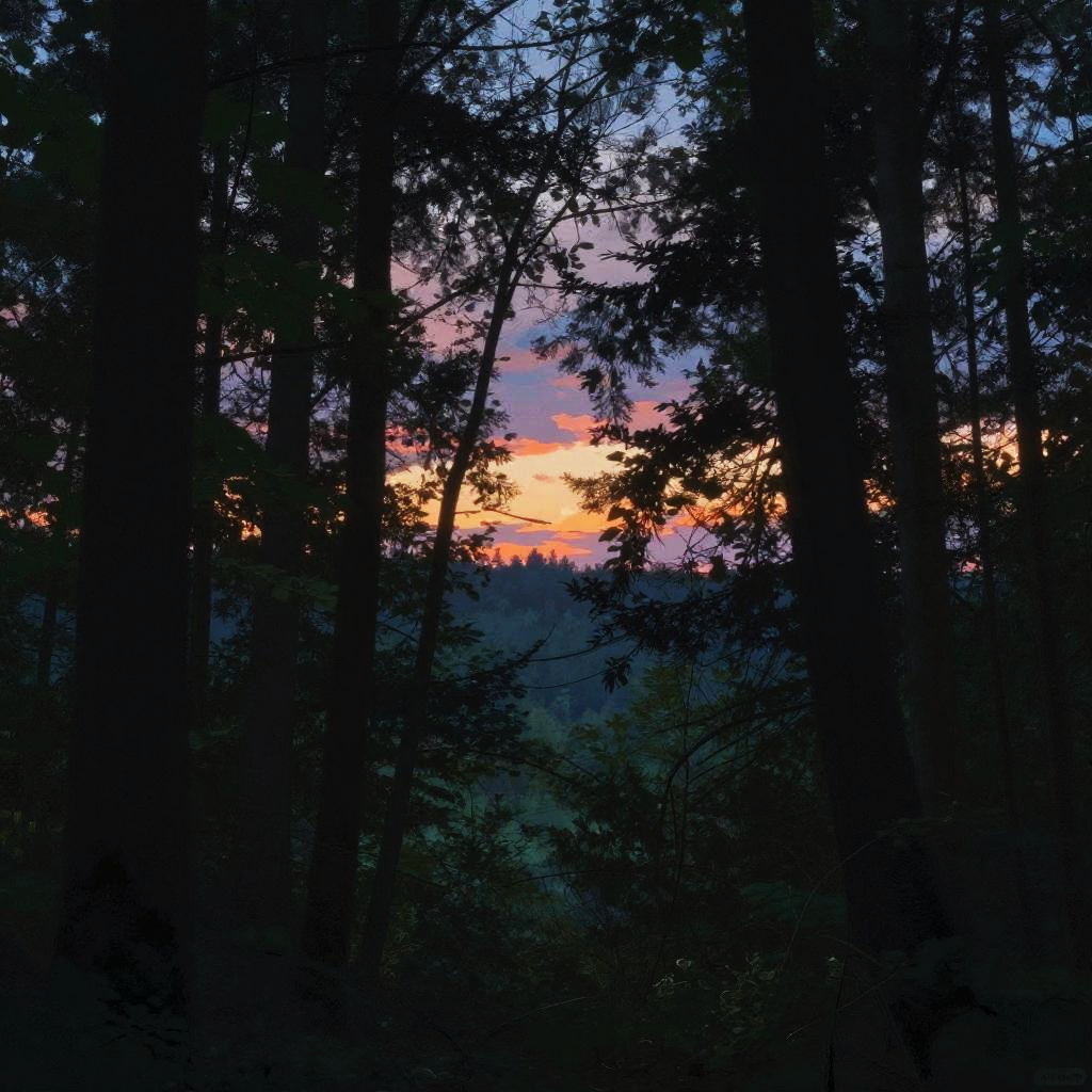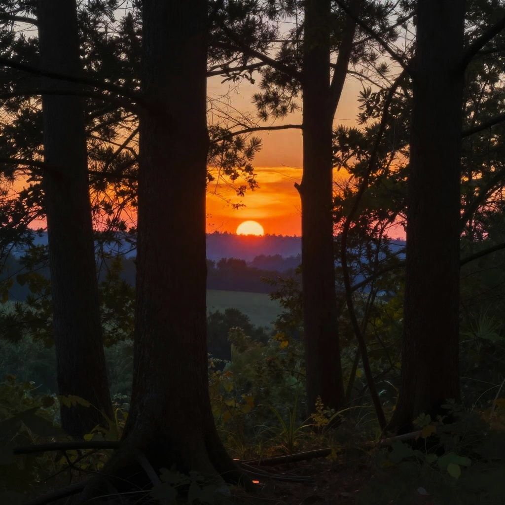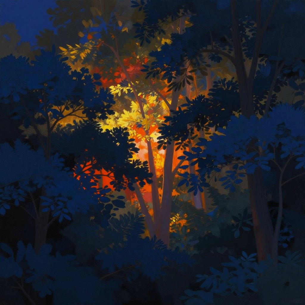A colorful midnight blue peeking between trees, vibrant colors, high quality, digital painting, detailed tree silhouettes, warm and intense glow, nature scene, landscape, scenic, atmospheric lighting, high contrast