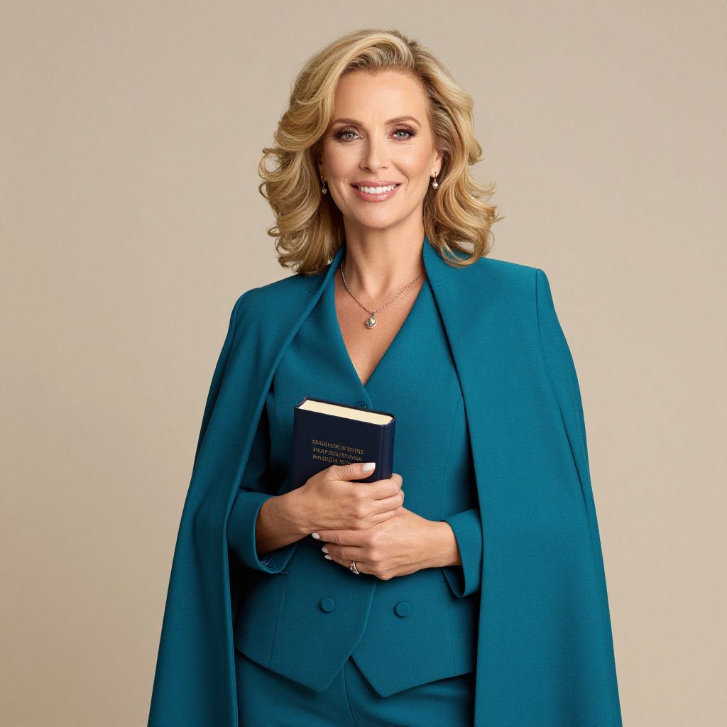 A woman with voluminous blonde hair, wearing a teal pant-suit with a cloak, holds a book and smiles warmly.