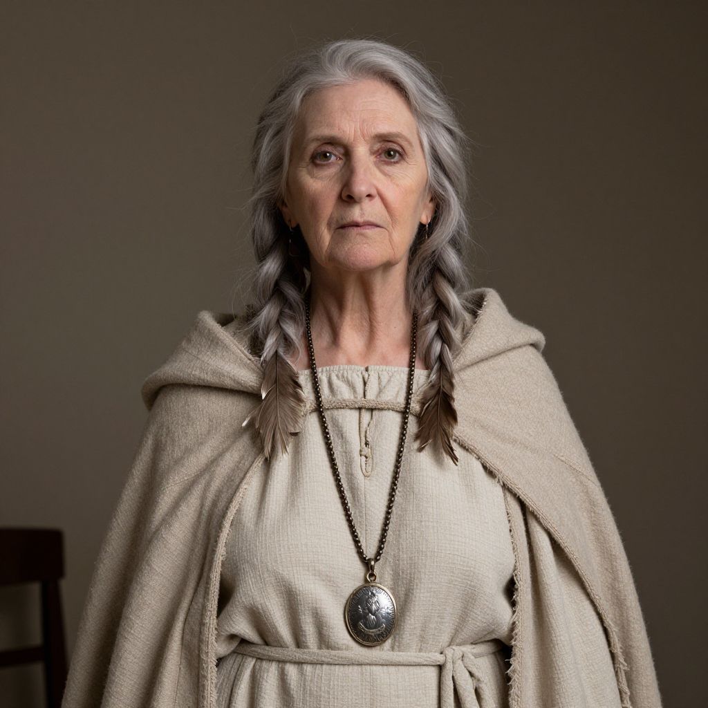 This is a photograph of an elderly woman with long, gray braided hair, wearing a beige, textured, woolen cloak over a matching dress with a tied waist. She has a solemn expression and is adorned with a long black necklace featuring a large, circular, silver pendant. The background is a plain, dark gray, which contrasts with her light-colored attire. The lighting is soft, highlighting her facial features and the texture of her clothing. The overall style of the photograph is realistic and slightly dramatic, focusing on the woman's aged, dignified appearance.
