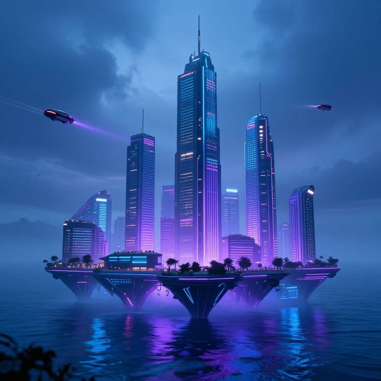 Floatingcityx in a futuristic ocean setting, neon lights illuminating sleek skyscrapers above water, flying vehicles zooming through misty skies, cyberpunk aesthetic with vibrant blues and purples, detailed architecture reflecting on calm waves
