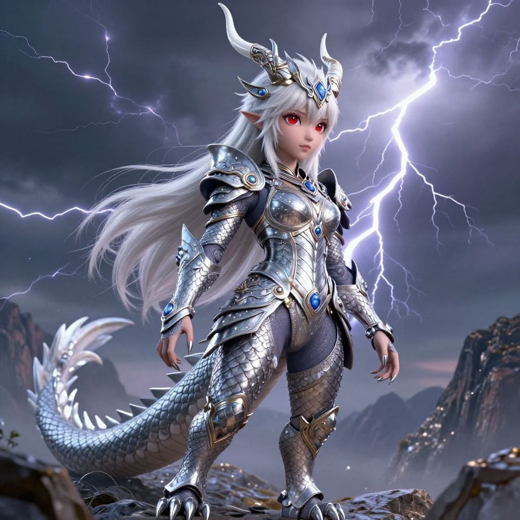 (thunder, composed of elements of thunder, thunder sky, lightning):1.2, (kirin armor), circlet, neck_rings, tail_jewelry, jewelry, leg jewelry, arm jewelry, body jewelry, pose, (uploaded on e621), by personalami, by isvoc, by zenthetiger, by eternity-zinogre, by yasmil, by Taran Fiddler, by Ruan Jia, by Silgiriya Mantsugosi, by Pino Daeni, (full body), solo, (8k, 4k, ultra HD, absurd res, top quality, best quality, max quality, masterpiece), extremely detailed, highly detailed, high details, intricate, realistic shading, highly detailed mountains, (scalie anthro dragon female:1.3), (realistic scales, detailed scale texture, silver scales:1.3), (small white scales:1.2), (two white horns):1.3, (white hair:1.2), long hair, sidecut haircut, (ultra detailed face, adorable face), (red eyes, intricate eye detail), eyeliners, (silver nails, silver claws), (4_fingers)