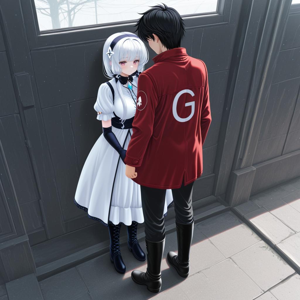 Anime-style illustration depicting a young man with short black hair wearing a red jacket and black boots standing closely facing a girl with white hair in a white dress, black gloves, and black lace-up boots. The scene is set indoors by a large dark door with sunlight casting shadows on the floor.
