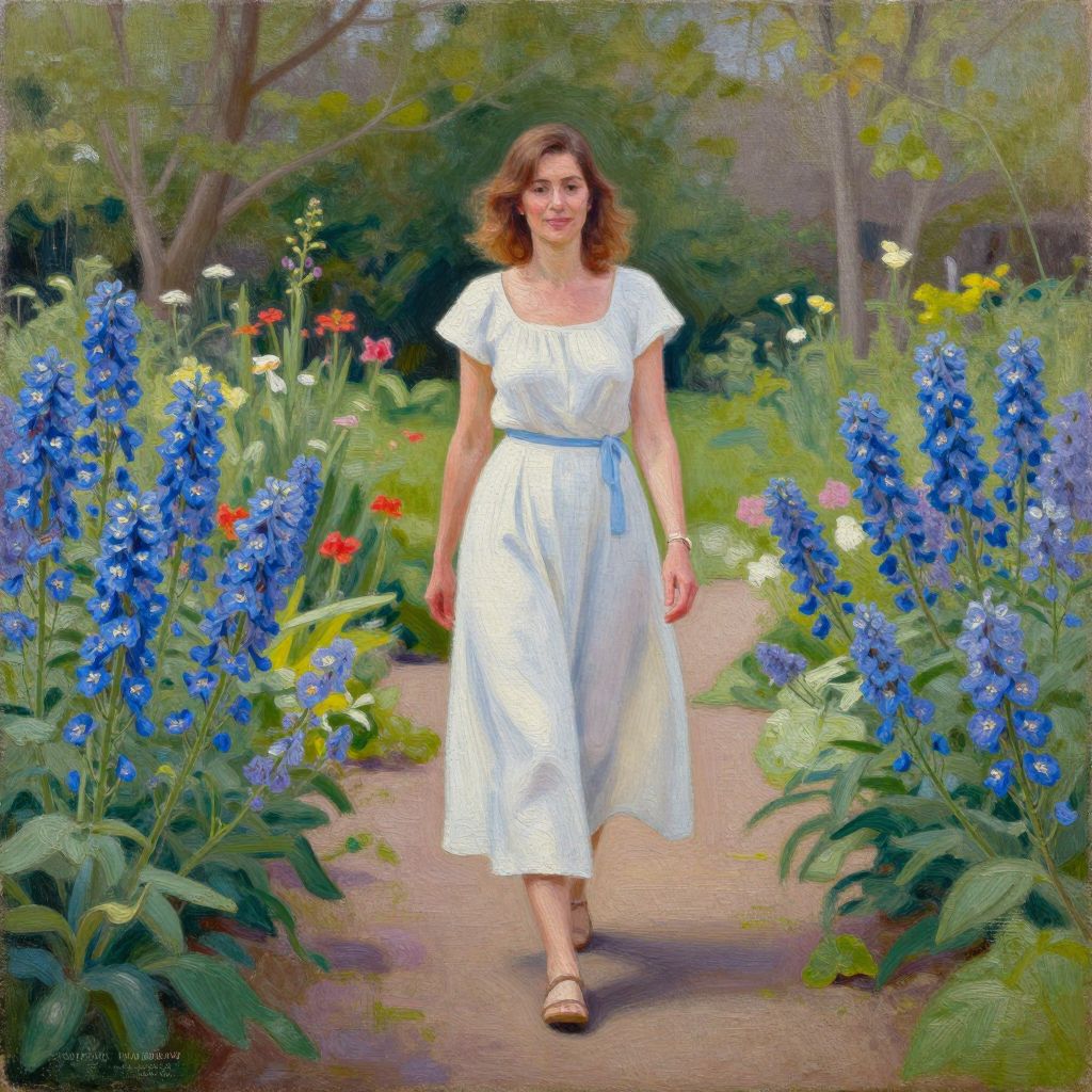 Digital painting of a woman in a white dress walking down a garden path, surrounded by vibrant blue, yellow, and purple flowers.